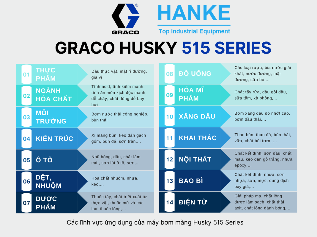 Dòng Graco Husky 515 được ứng dụng đa dạng trong nhiều ngành nghề nhờ khả năng tương thích cao với nhiều loại chất lỏng: