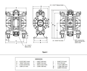 Máy bơm có cổng hút/xả vật liệu 1/2”-14 NPT và cổng khí nén 1/4”-18 NPT. Kích thước tổng thể: dài 288 mm, rộng 207 mm, cao 282 mm. Các cổng có thể xoay đổi hướng nhờ nới lỏng bulông, thuận tiện lắp đặt